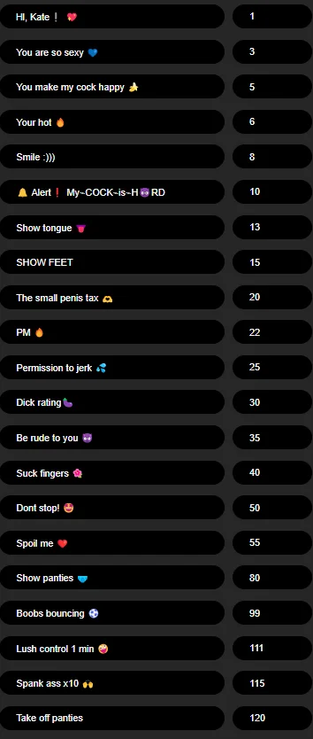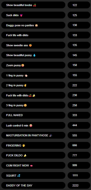 Ahegao, Outdoor, Blowjob, Cock Rating, Dildo or Vibrator, Dirty Talk, Masturbation, Striptease, Topless, Erotic Dance, Flashing, Jerk-off Instruction, Latex, Office, Smoking, Deepthroat, Twerk, Upskirt, Squirt, Shower, Sex Toys, Orgasm, Humiliation
